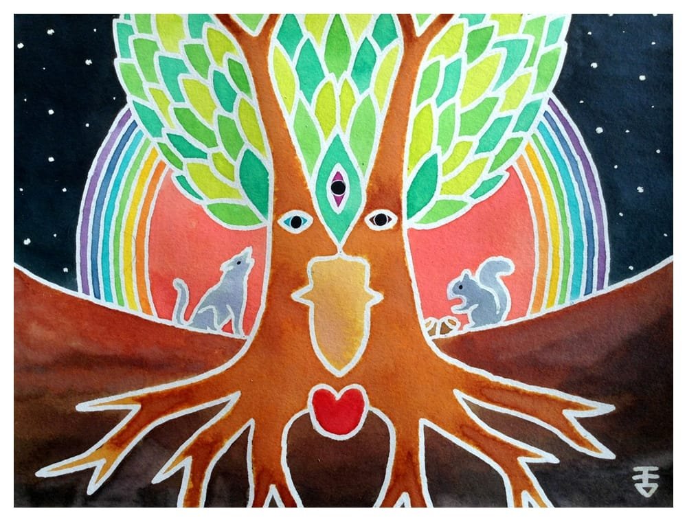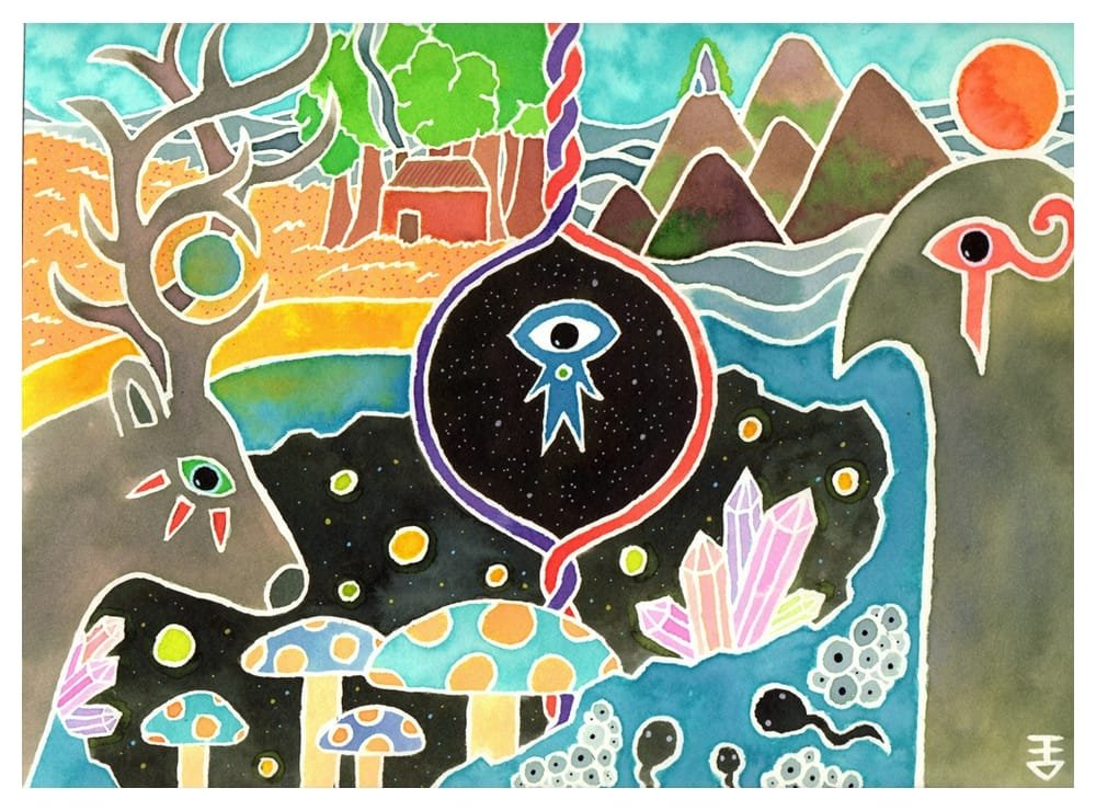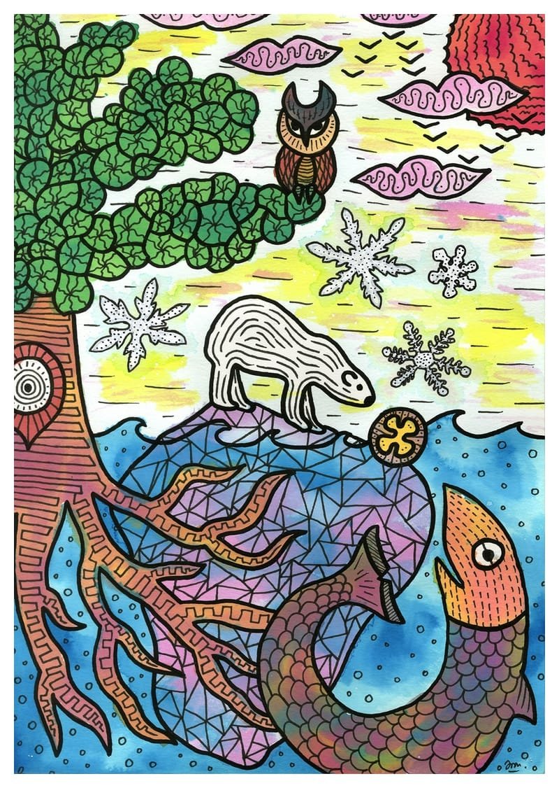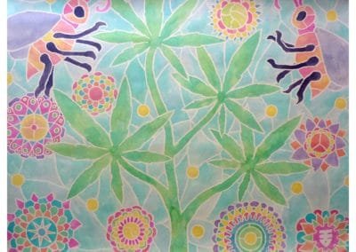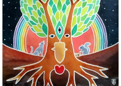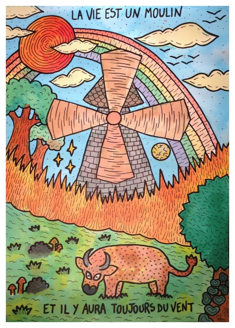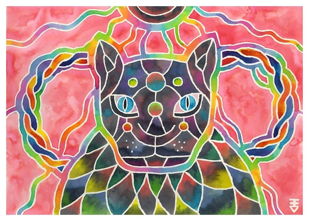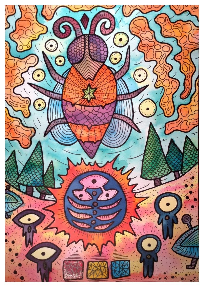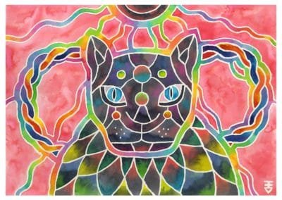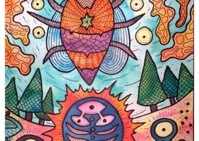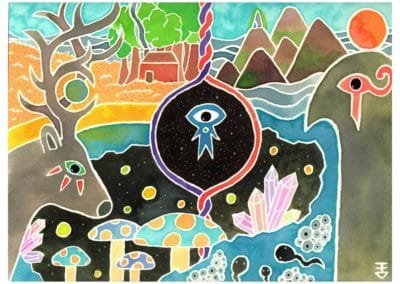 Si les Posca restent mon style préféré, j’ai exploré d’autres techniques. Pour la plupart de ces tableaux, j’utilise de l’aquarelle liquide ; les plus récents sont effectués au crayon de couleur. L’inspiration est toujours sauvage et chamanique, dans un style plus naïf que mes autres dessins.