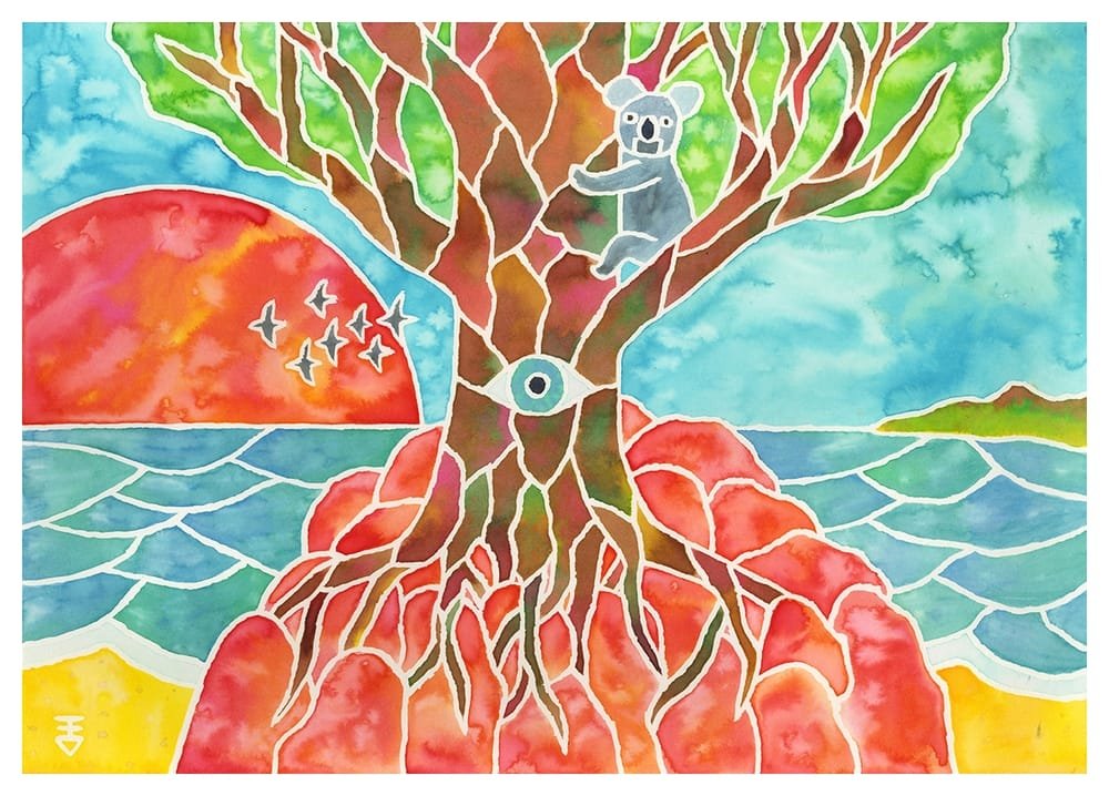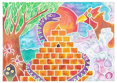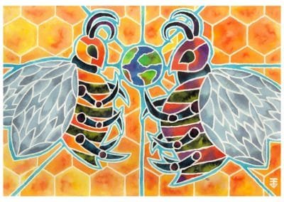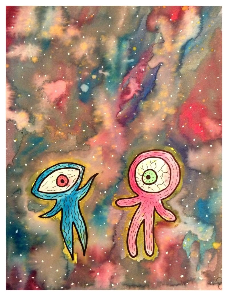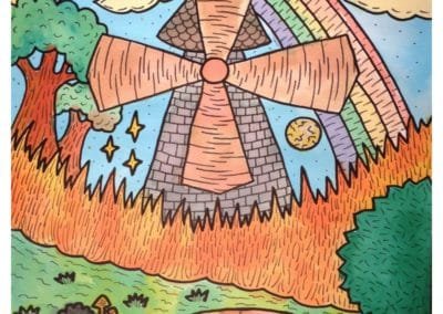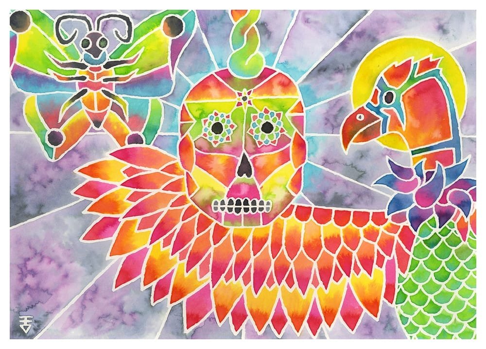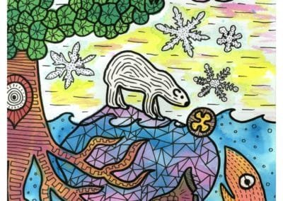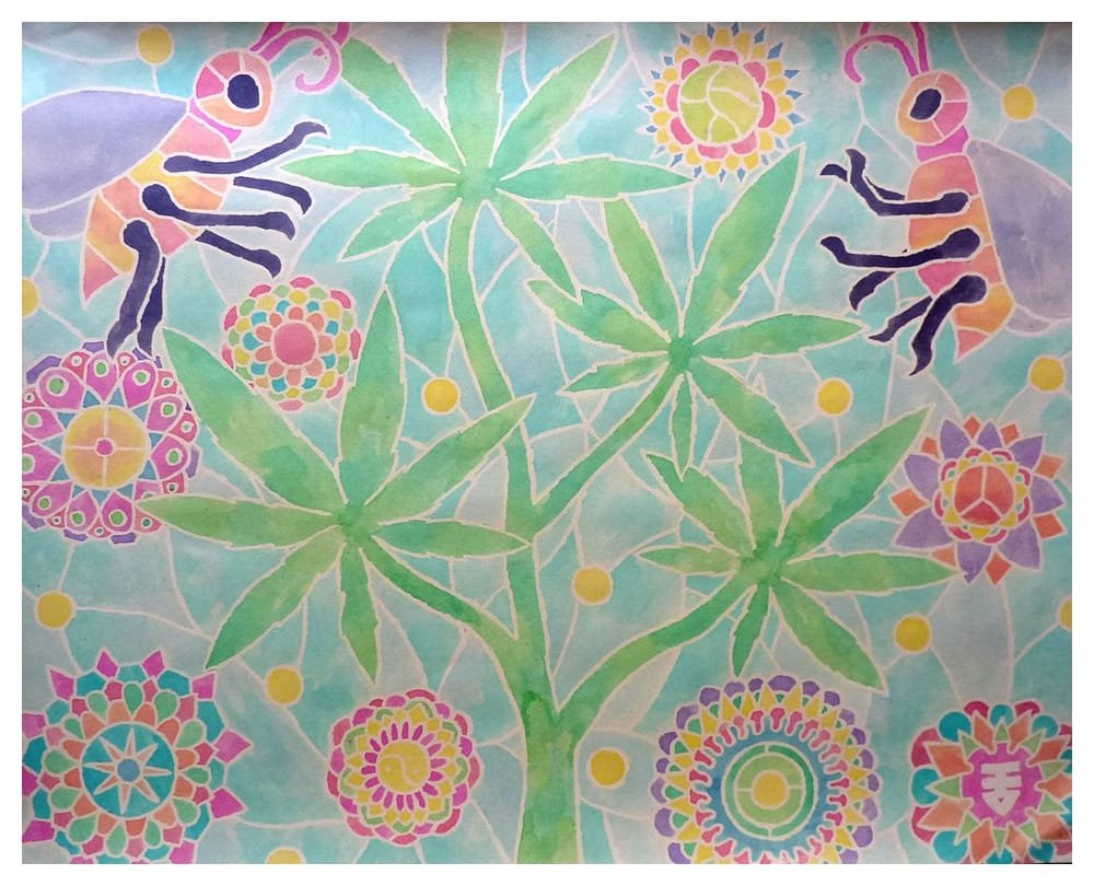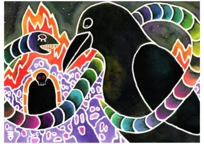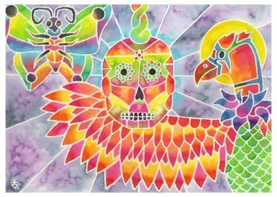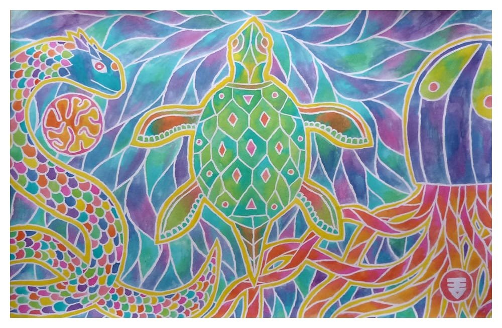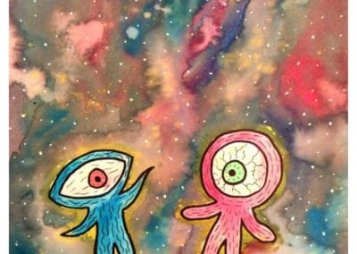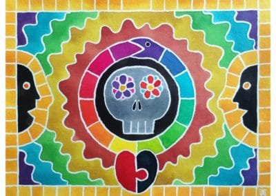 Si les Posca restent mon style préféré, j’ai exploré d’autres techniques. Pour la plupart de ces tableaux, j’utilise de l’aquarelle liquide ; les plus récents sont effectués au crayon de couleur. L’inspiration est toujours sauvage et chamanique, dans un style plus naïf que mes autres dessins.