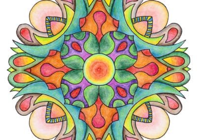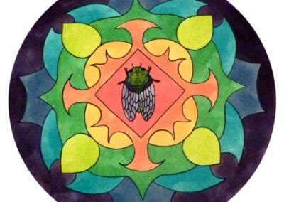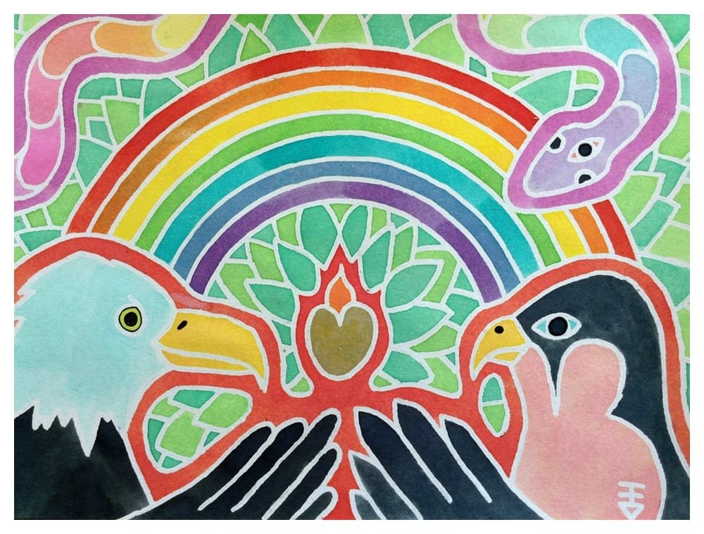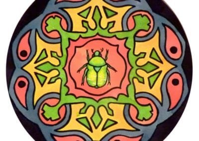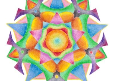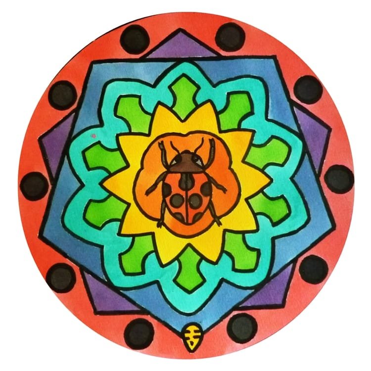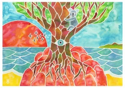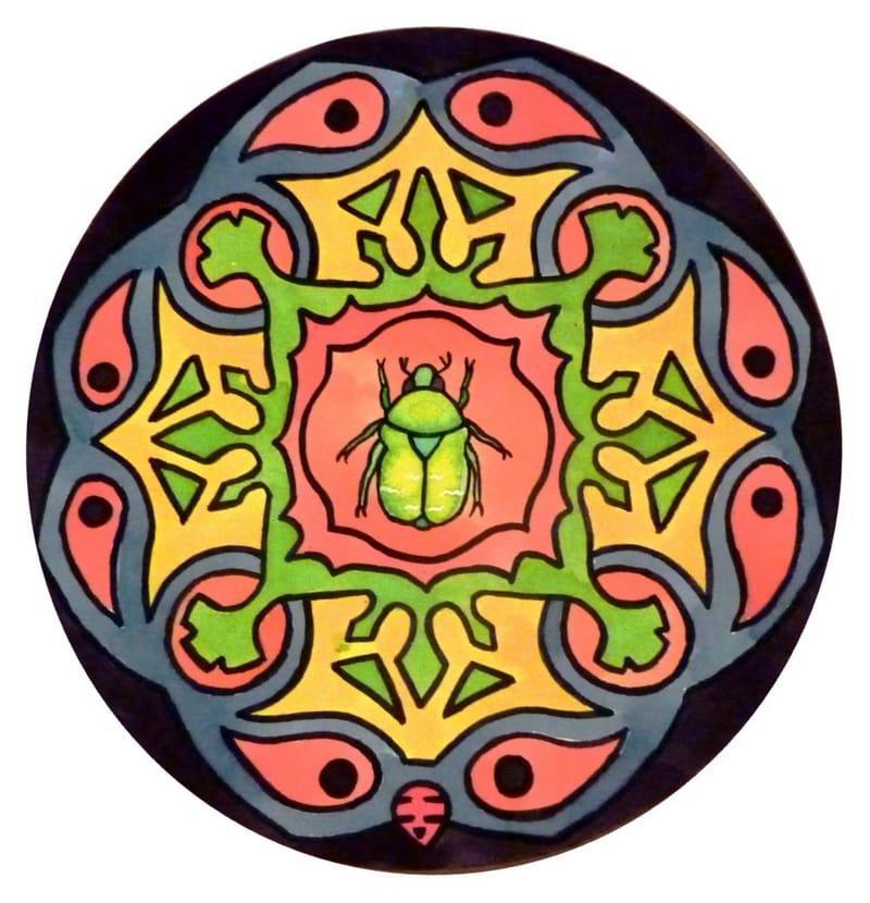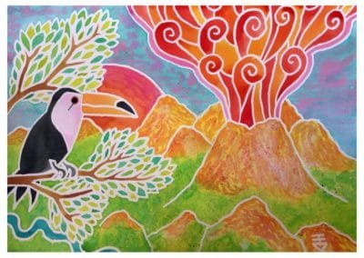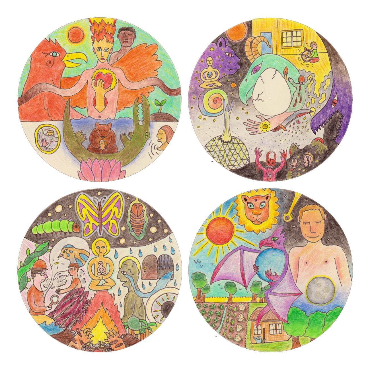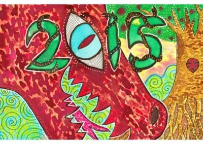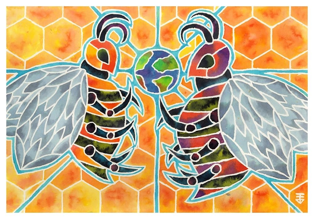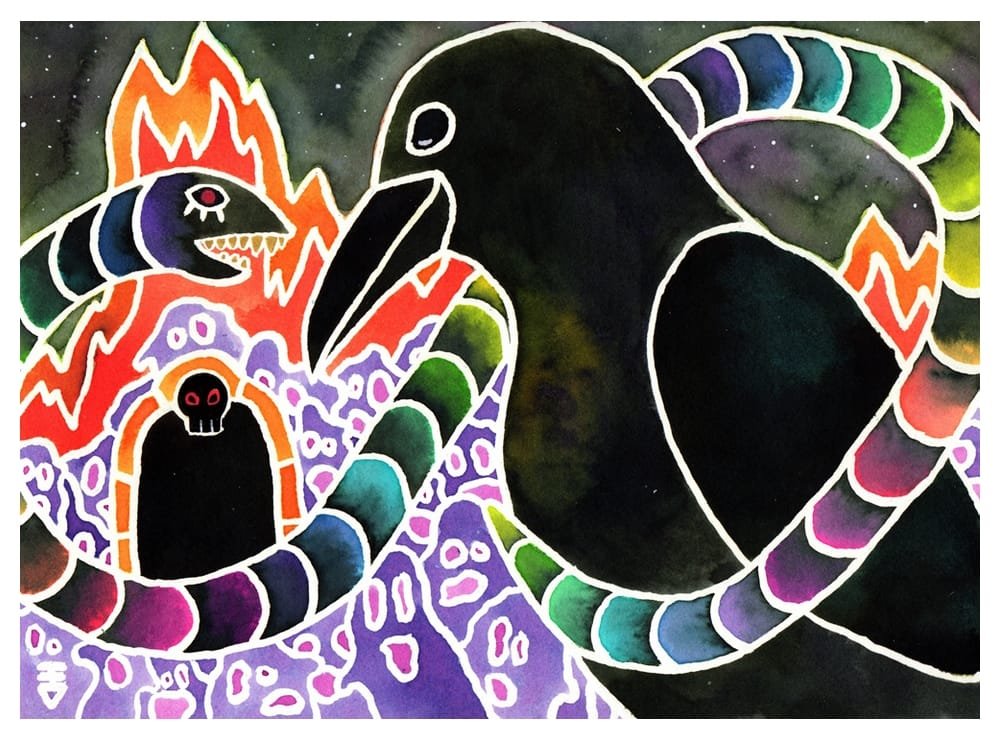 Si les Posca restent mon style préféré, j’ai exploré d’autres techniques. Pour la plupart de ces tableaux, j’utilise de l’aquarelle liquide ; les plus récents sont effectués au crayon de couleur. L’inspiration est toujours sauvage et chamanique, dans un style plus naïf que mes autres dessins.