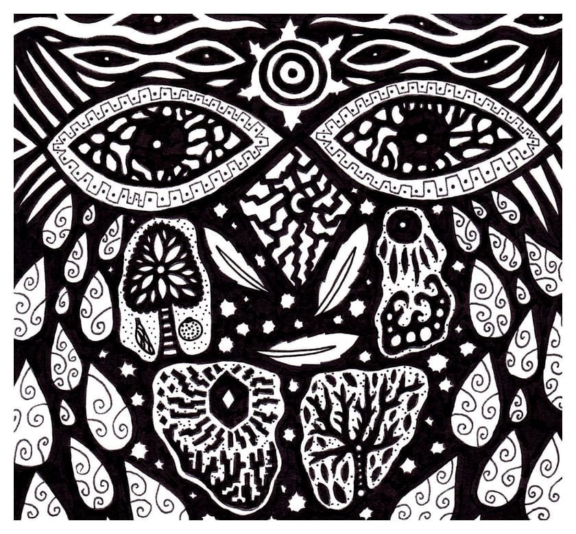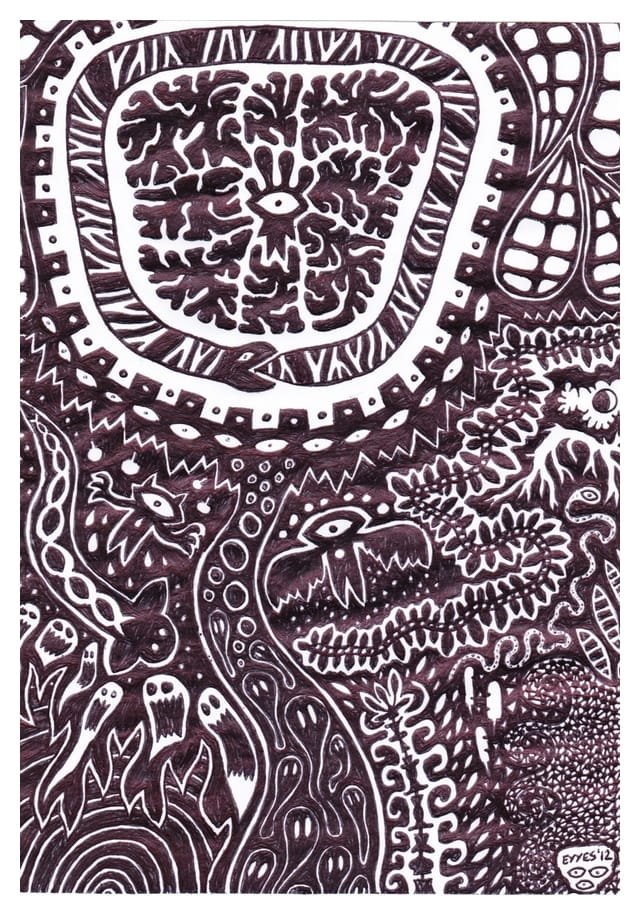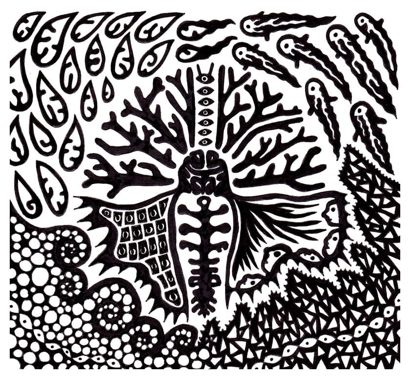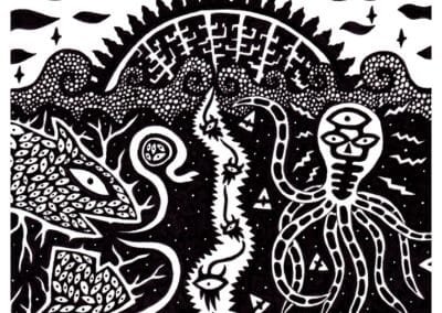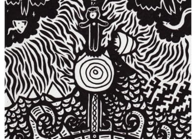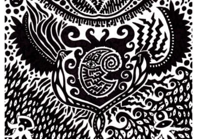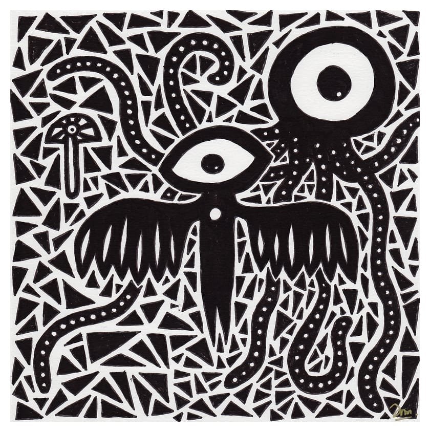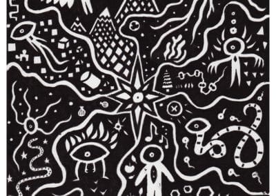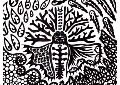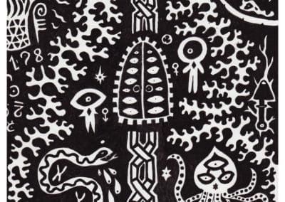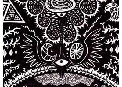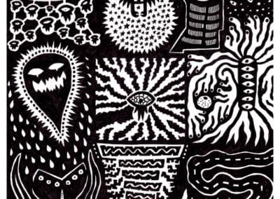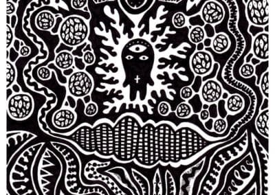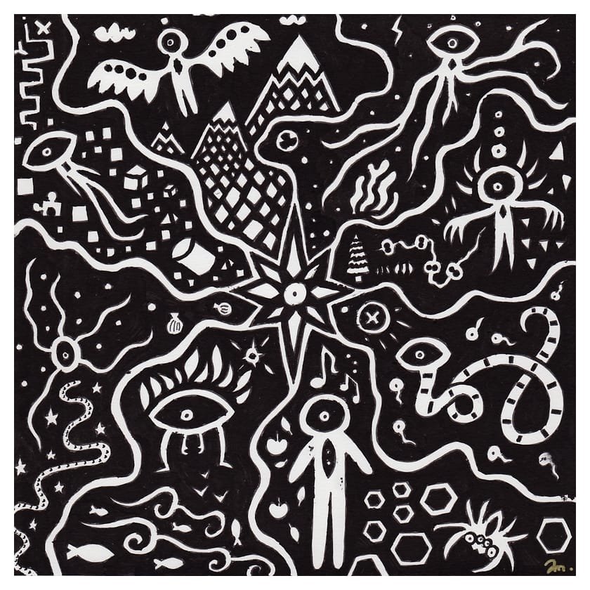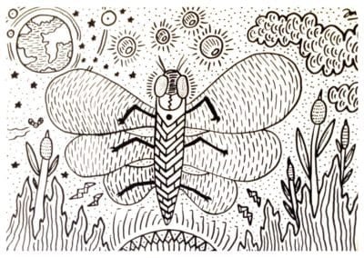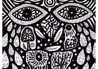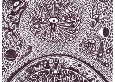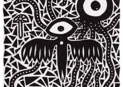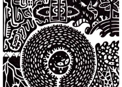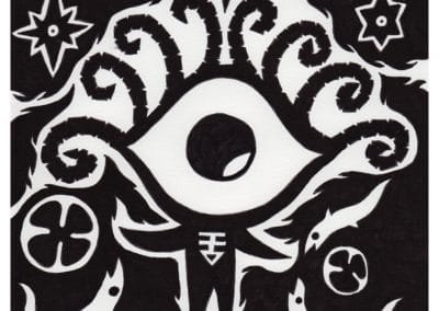 Ce sont mes premiers dessins à la main, d’abord au stylo à bille puis au feutre fin. J’y invente Nébulon, un petit extraterrestre cyclope et polymorphe qui se retrouve sur la couverture de mon premier album musical Insomnia (2013) ; album pour lequel j’ai conçu un dessin unique pour chacune des dix chansons. J’ai après abandonné ce style monochrome au profit de la couleur, plus riche et expressive.
