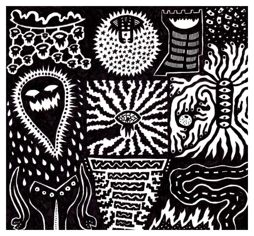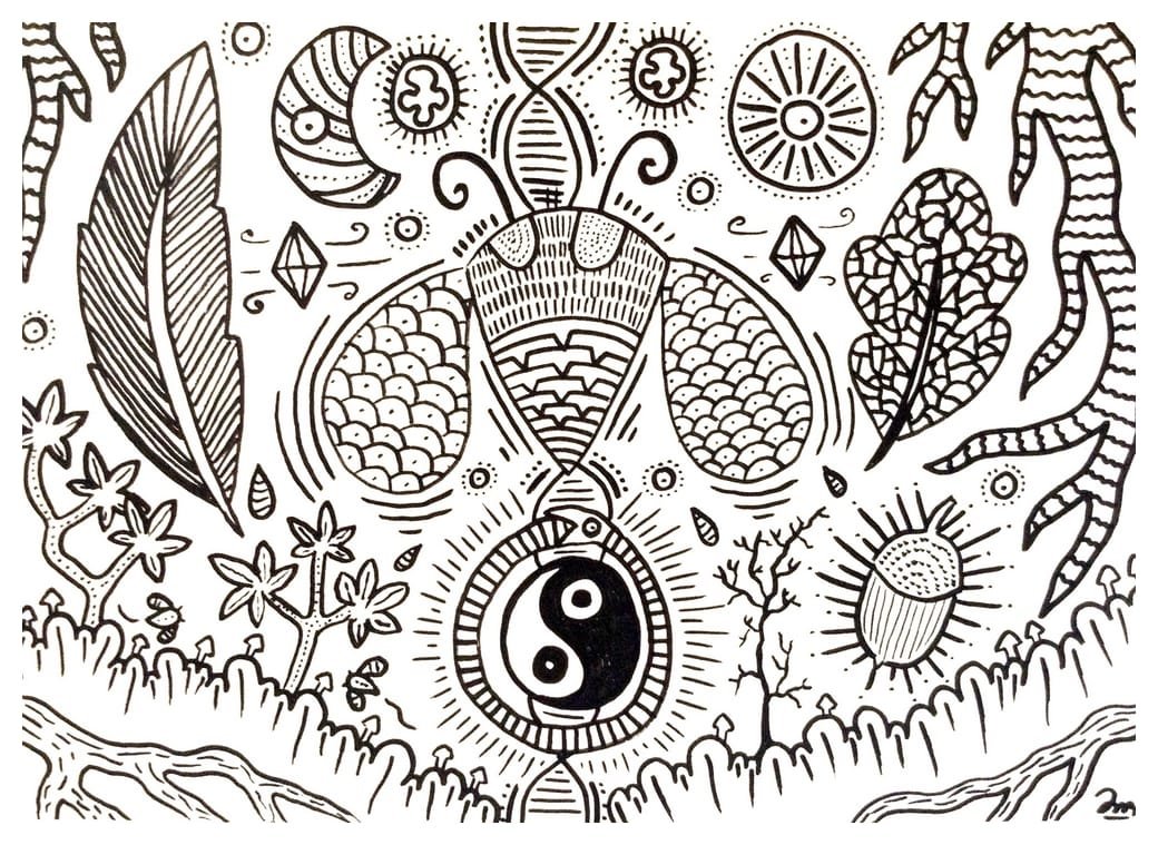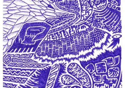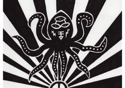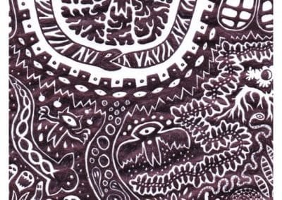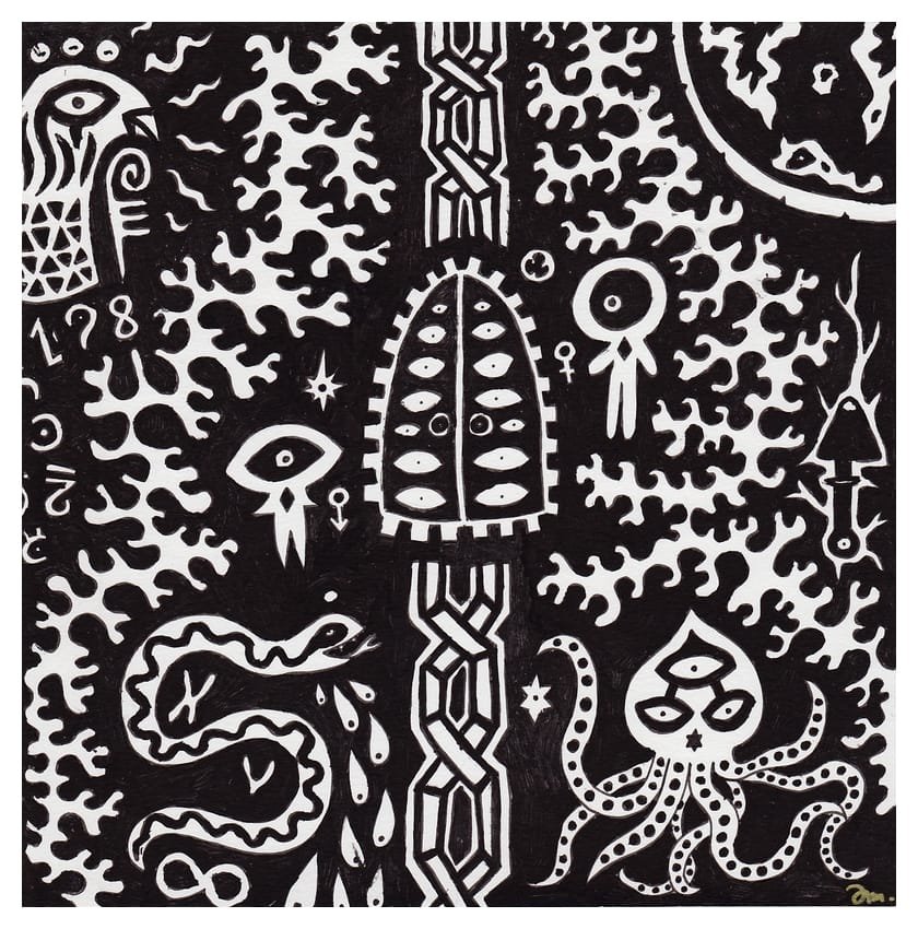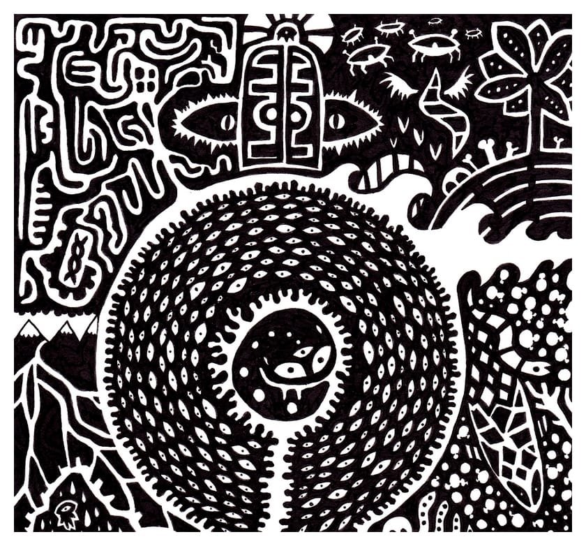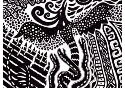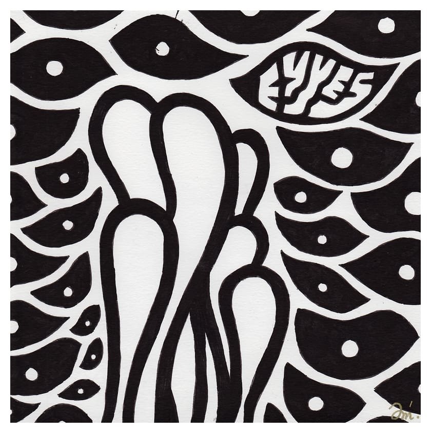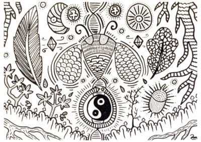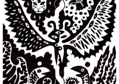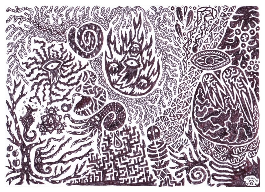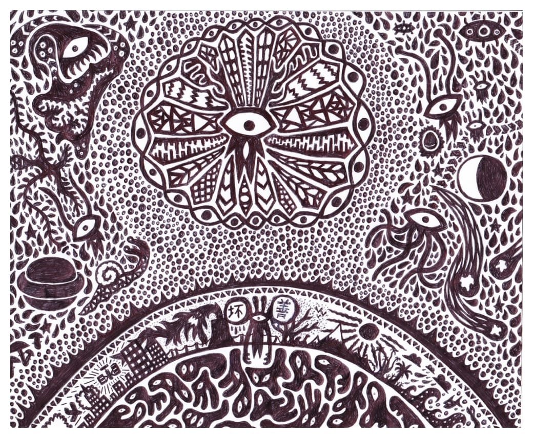 Ce sont mes premiers dessins à la main, d’abord au stylo à bille puis au feutre fin. J’y invente Nébulon, un petit extraterrestre cyclope et polymorphe qui se retrouve sur la couverture de mon premier album musical Insomnia (2013) ; album pour lequel j’ai conçu un dessin unique pour chacune des dix chansons. J’ai après abandonné ce style monochrome au profit de la couleur, plus riche et expressive.